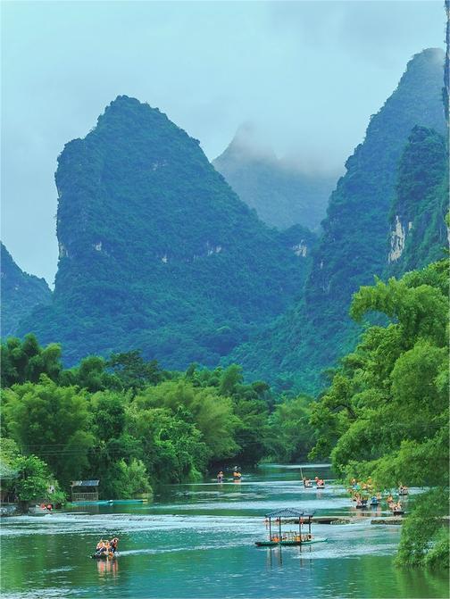 A passage in a primary school Chinese textbook titled "The scenery of Guilin ranks first under heaven" refers to touring the Li River. The mountains on both sides of the Li River are majestic, towering, and come in various shapes, which represent the essence of Guilin's scenery. "The hundred - mile Li River is like a hundred - mile art gallery." Every view here is a typical Chinese ink painting. In the Li River Scenic Area, green peaks line the banks, green waters wind around, there are canyon cliffs, hanging springs and flying waterfalls, oases and dangerous shoals, as well as strange caves and beautiful stones. The scenery is ever - changing. Dozens of well - known scenic spots are distributed along the river: Wujiaotan, Nine Oxen and Three Islets, Bat Mountain, Wife - waiting Stone, Caoping Scenery, Crown Cave, Embroidery Mountain, Half - way Strange Ferry, Immortal Pushing the Mill, Yangdi Scenery, Carp Hanging on the Cliff, Langshi Wonder, Halong Bay, Chicken Coop Mountain, Eight Immortals Crossing the River, Five - Finger Mountain, Turtle Climbing the Hill, Nine - Horse Mural Hill, Huangbu Reflection (the background of the 20 - yuan RMB note), Camel Crossing the River, Chaoban Mountain, Xingping's Beautiful Scenery, Snail Mountain, Fishing Village, Dragon Head Mountain and so on. Generally, the main ways to tour the Li River include taking a boat, a bamboo raft, or hiking, including three - star and four - star Li River cruises, bamboo raft tours on the Li River, and big - boat tours to Xingping Fishing Village.